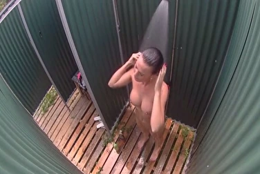 Брюнетка моется в публичном душе не подозревая о скрытых камерах